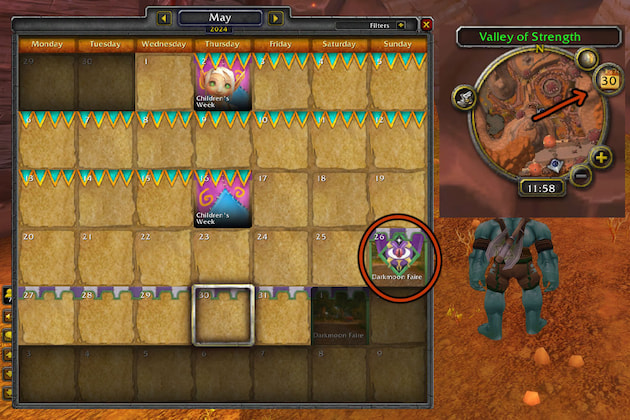 You can quickly check when the next Darkmoon Faire starts by clicking on the calendar icon on your minimap.
