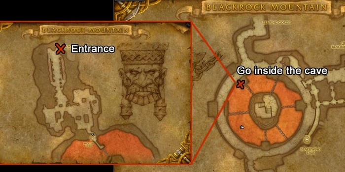 To get to Blackrock Depths, enter Blackrock Mountain from either southwest Searing Gorge or northwest Burning Steppes. After you enter Blackrock Mountain, open your map and head to the location I marked with a red X on the map below, then go inside the cave. Now you can open your map again, and you will see the entrance to Blackrock Depth on this map.