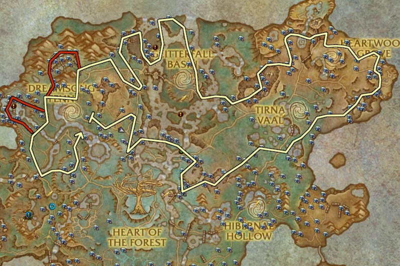 This route basically just loops around the other side of the map, so you have an alternative farming route if the other route is farmed by someone else. You can try to extend the route to the red lines if you have good gear. (or if you have something like Feign Death)