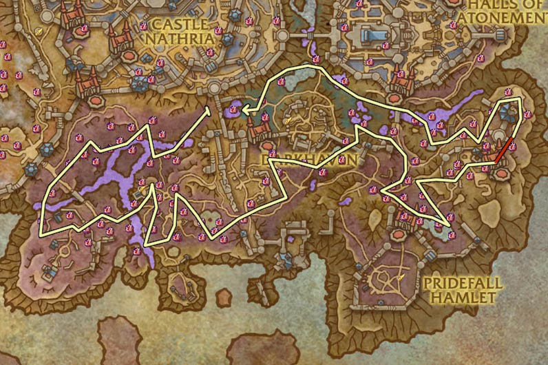 I gathered the most Widowbloom by doing a loop in the lower part of Revendreth. There is a lift at the red line, so you have to wait for it to come up, or you can just jump down if you have any ability that you can use to survive the fall. Also, there are a few elite mobs before the lift, so if you are having trouble there, you can just go around that whole area skipping the lift and the elites. There is only one herb node up there, so you won't miss that much.