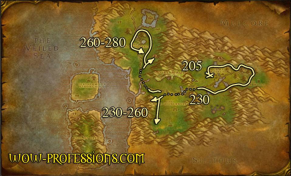 From 165 to 205, follow the path you see on the map below. Make sure that you have Skinning 205 before you leave Thousand Needles.
