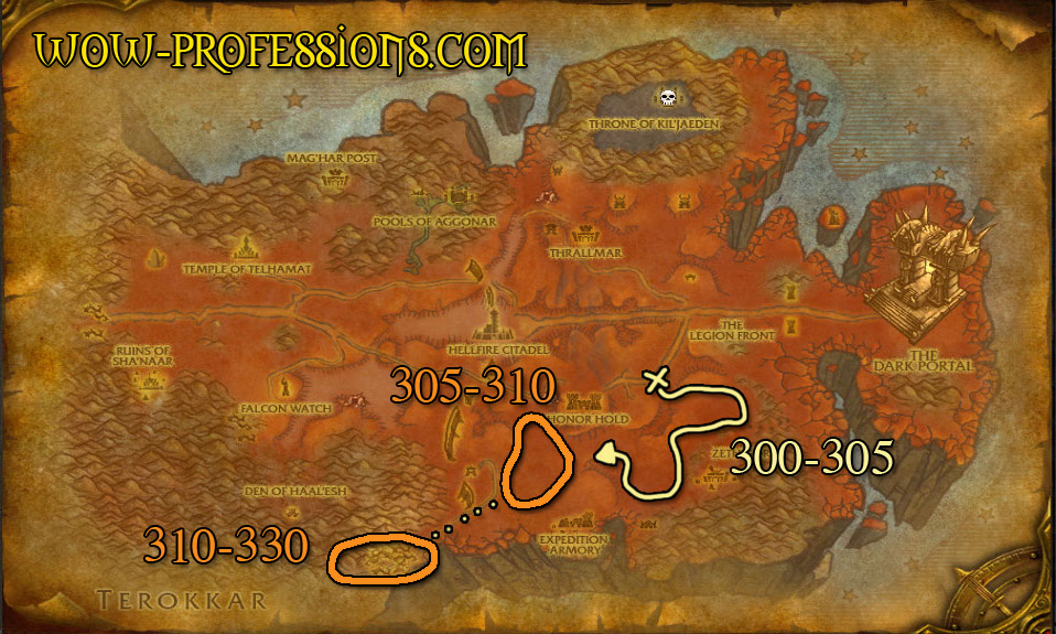 Start with skinning the Starving Helboars around Zeth'gor until you reach 305. Once you reach 305, you can head to the next part and start skinning Deranged Helboars, and at around 310 you can head over to the next part to skin Razorfang Hatchlings and Razorfang Ravagers.